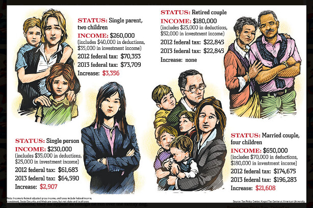 This is astonishing, and exactly the kind of thing that enables people earning two hundred thousand dollars a year to think they are ‘poor’ or ‘middle class’. Holy hell, these cartoons would make more sense if the incomes mentioned above were all cut to 1/10th shown. But then the tax increase wouldn’t be there, and the WSJ would have nothing to report on, would they?